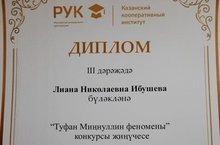 Шушы көннәрдә 9 нчы Б сыйныфы укучысы Ибушева Лиана “Туфан Миңнуллин феномены” конкурсында 3 нче дәрәҗә диплом белән бүләкләнде.