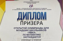 Гимназиябез укучысы С.Аиша, әле 1 нче сыйныфта гына булуга карамастан, инде яңа үрләр яулый башлады. Ул математика буенча башлангыч сыйныфлар өчен үткәрелгән “УМКА” ачык олимпиадасында катнашып, призер исеменә лаек булды. Нәни укучыбыз өчен без бик шат. Аңа алга таба да уңышлар телибез!