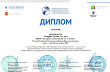 Н.И.Лобачевский исемендәге Бөтенроссия фәнни конференциясендә 11 нче сыйныф укучыбыз Таһирова Лилия “Татар теле һәм әдәбиятының актуаль проблемалары” секциясендә “Әмирхан йорты - XX гасыр башы татар дөньясының милли-мәдәни үзәге” дип аталган доклады белән I дәрәҗәле диплом белән бүләкләнде. Без аны котлыйбыз һәм алга таба да зур үрләр яулавын телибез!