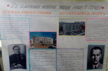 Гимназиябездә “Аларның исемнәре белән безнең шәһәр урамнары аталган” дип исемләнгән иҗади эшләр конкурсы үтте. Укучылар кызыклы һәм эчтәлекле эшләр башкардылар. Алар Девятаев, Рихард Зорге, Захитов, Гаврилов, Карбышев урамнары исемнәренең килеп чыгышын ачыкладылар, бу шәхесләр турында күп кенә мәгълүмат бирделәр. Балалар әлеге эш белән бик теләп шөгыльләнделәр, чөнки үзләренә дә урам исемнәренең килеп чыгышы кызыклы иде. Бу конкурс белән без күпмедер дәрәҗәдә укучыларны шәһәребезнең тарихына да кызыксыну уяттык дип саныйбыз.
