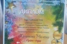 Яңа ел алдыннан гына «Казан Кремле» Дәүләт тарих-архитектура һәм сәнгать музей-тыюлыгында “Кар кызына – алкалар” дип исемләнгән бәйге узды. Шушы бәйгедә 1нче сыйныф укучысы Калинина М. катнашып, (сыйныф җитәкчесе- Җиһаншина Гүзәлия Хәбибулловна) җиңү яулады һәм гран-при дипломына лаек булды. Афәрин! Миленаны һәм Гүзәлия Хәбибулловнаны уңышлары белән котлыйбыз!