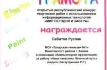 В целях выявления и поддержки одаренных детей, занимающихся информационными технологиями, развития мотивации и стимулирования интереса учащихся к углубленному изучению компьютерной техники и информационных технологий 25.03.11 прошел открытый Республиканский конкурс творческих работ с использованием информационных технологий «Мир сегодня и завтра». Поздравляем победителя САБИТОВА РУСЛАНА, ученика 6Б класса, занявшего III место в номинации «Компьютерная презентация» за работу «Наша галактика. Млечный путь»