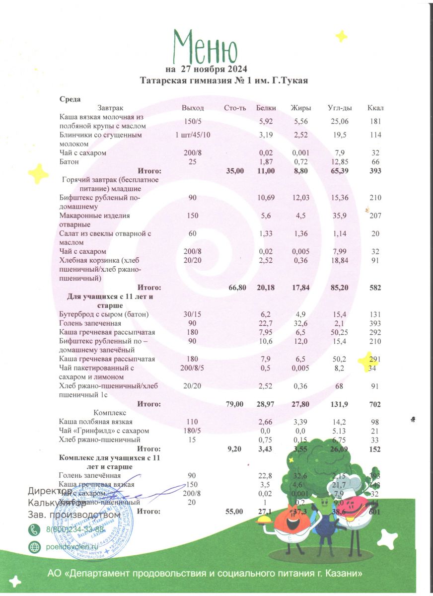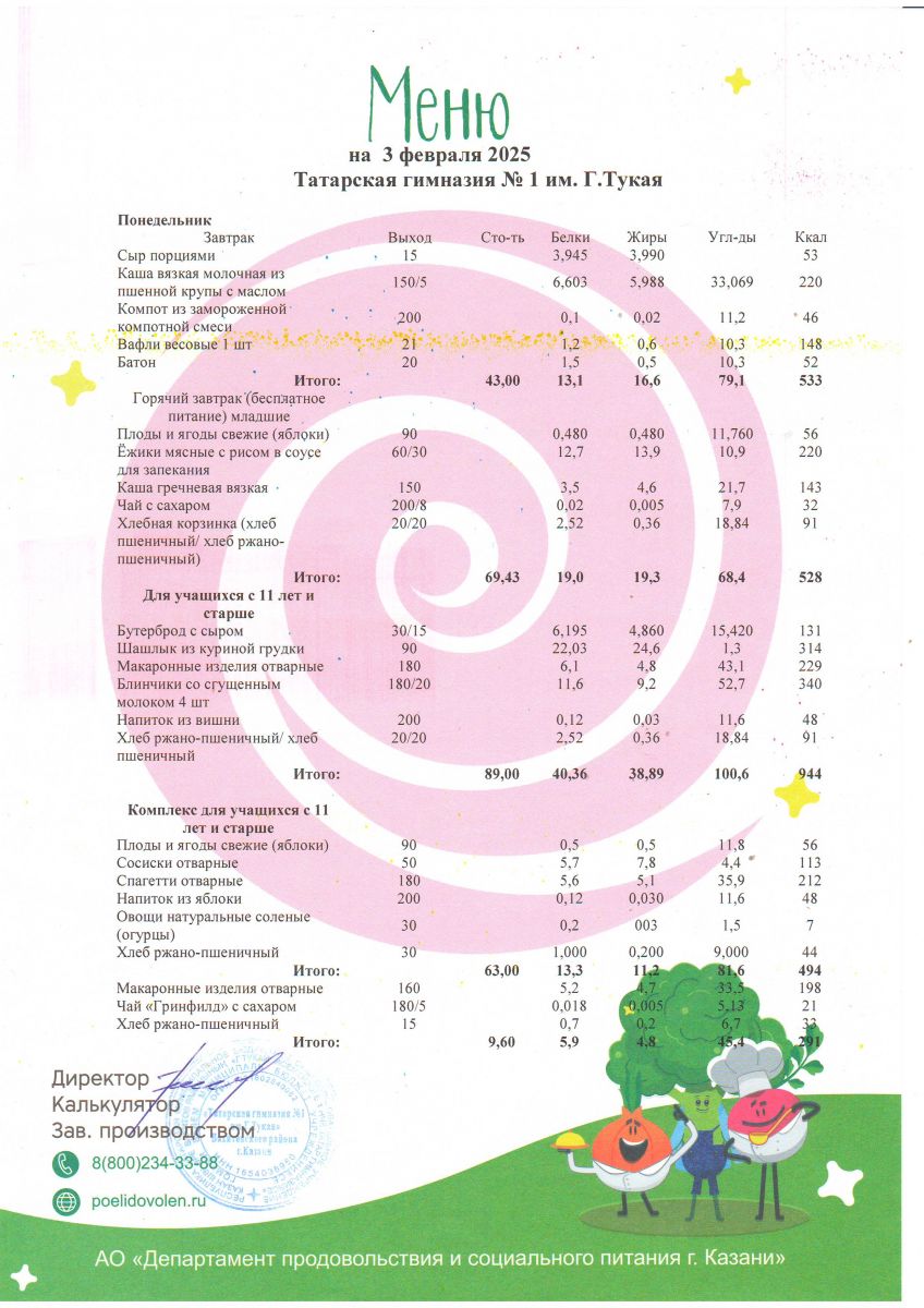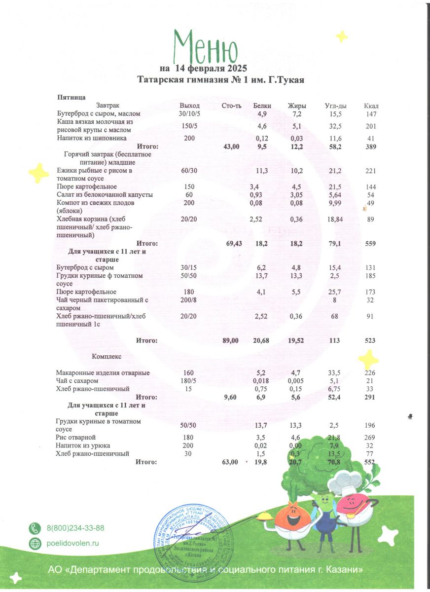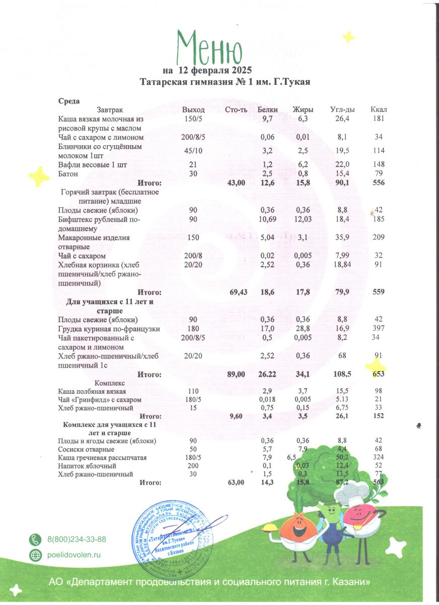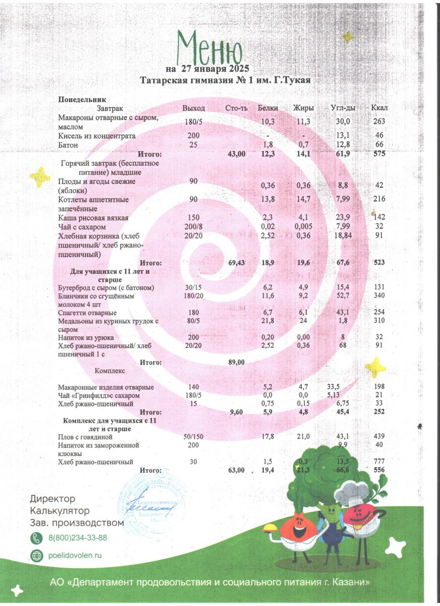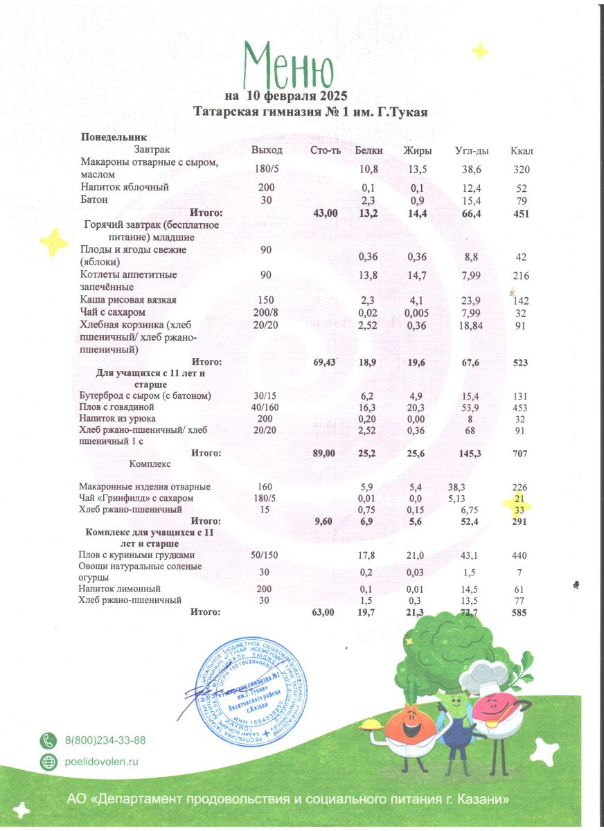 Услуги по организации питания в общеобразовательном учреждении МБОУ "Татарская имназия №1 им. Г. Тукая" г. Казани предоставляет АО "Департамент продовольствия и социального питания г. Казани" на основании договора, заключенного между образовательным учреждением и Депортаментом. АО «Департамент продовольствия и социального питания г.Казани»