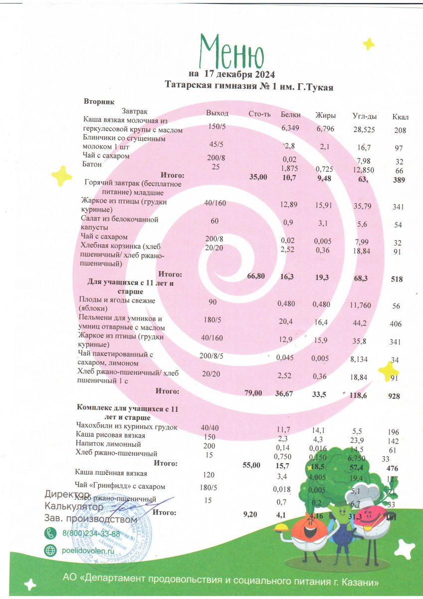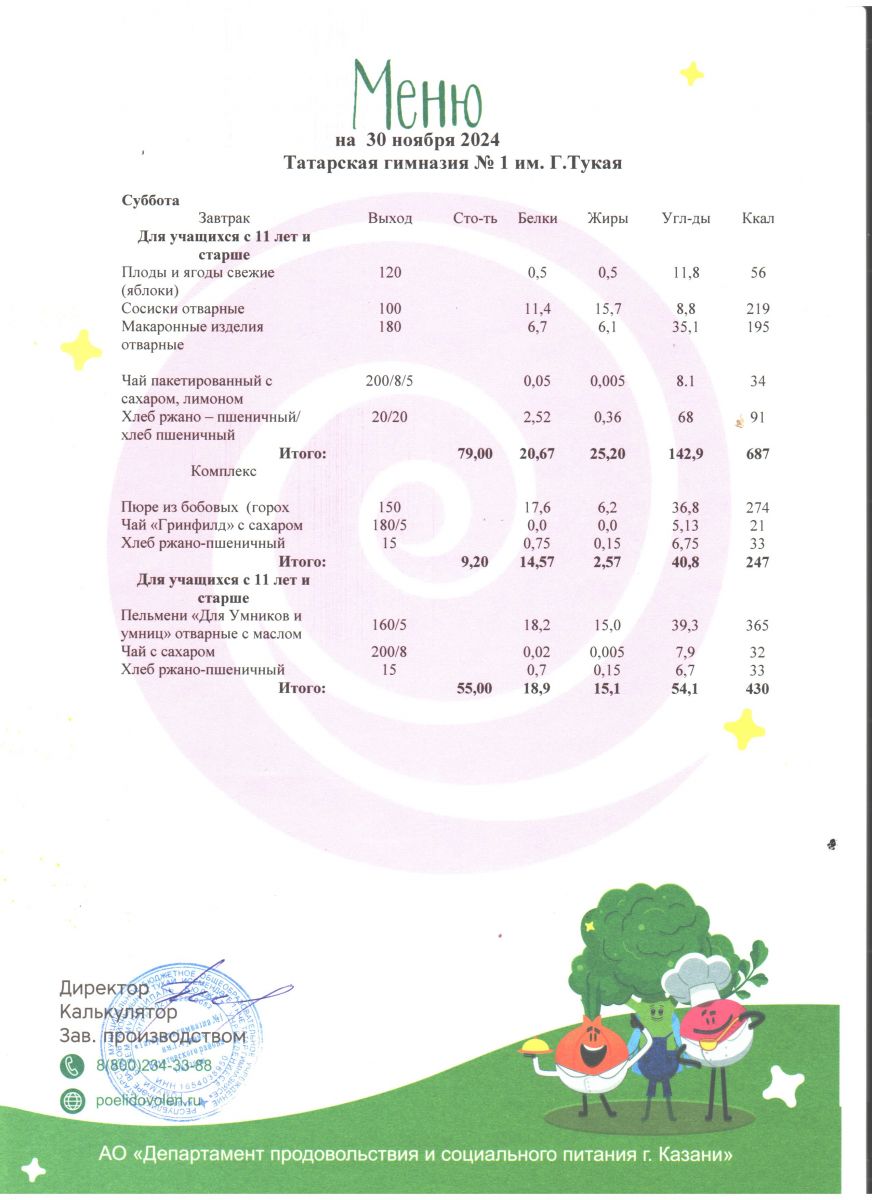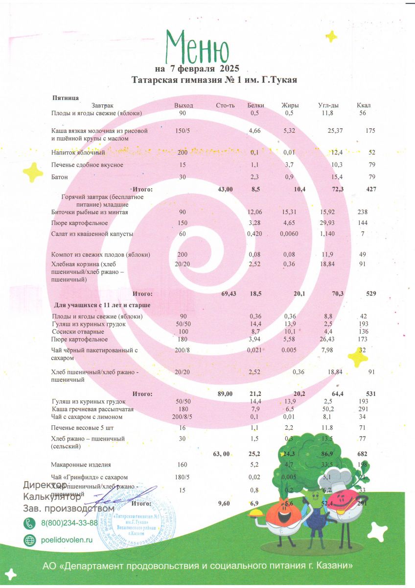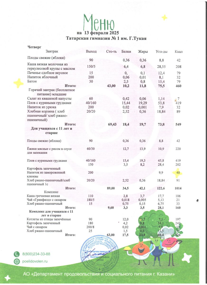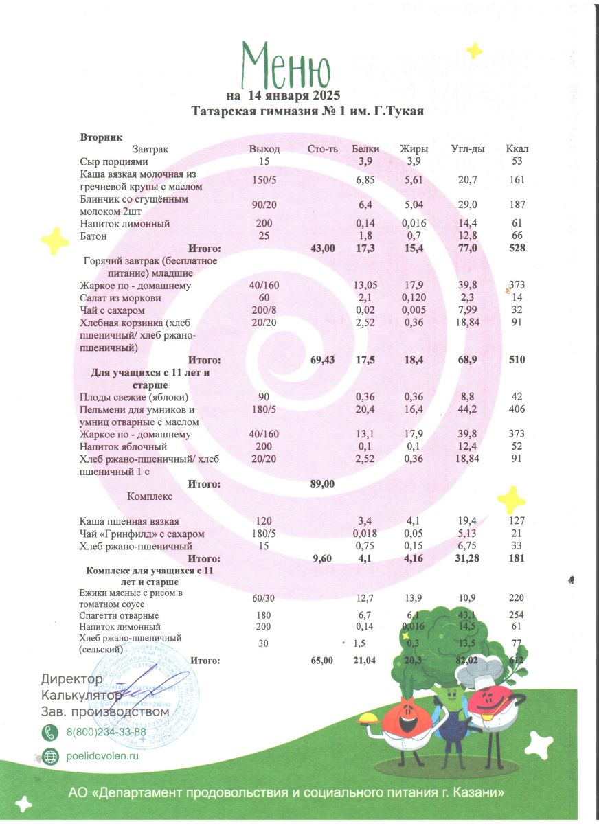 Услуги по организации питания в общеобразовательном учреждении МБОУ "Татарская имназия №1 им. Г. Тукая" г. Казани предоставляет АО "Департамент продовольствия и социального питания г. Казани" на основании договора, заключенного между образовательным учреждением и Депортаментом. АО «Департамент продовольствия и социального питания г.Казани»
