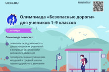 С 1-20 ноября 2022 года пройдет Всероссийская онлайн-олимпиада "Безопасные дороги" на платформе учи.ру для учащихся 1-9 классов.