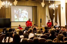 Игроки «Стрелы» Герман Давыдов, Омари Гриняев и Джереми Джордаан посетили гимназию № 3 Казани, где провели «Урок регби» для учеников младшей школы – всего встречу с регбистами посетили около ста ребят.