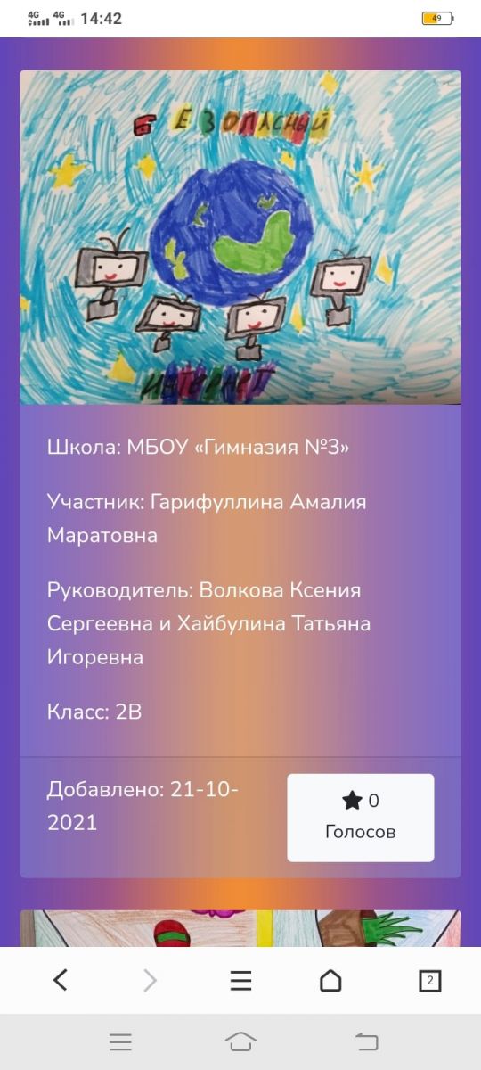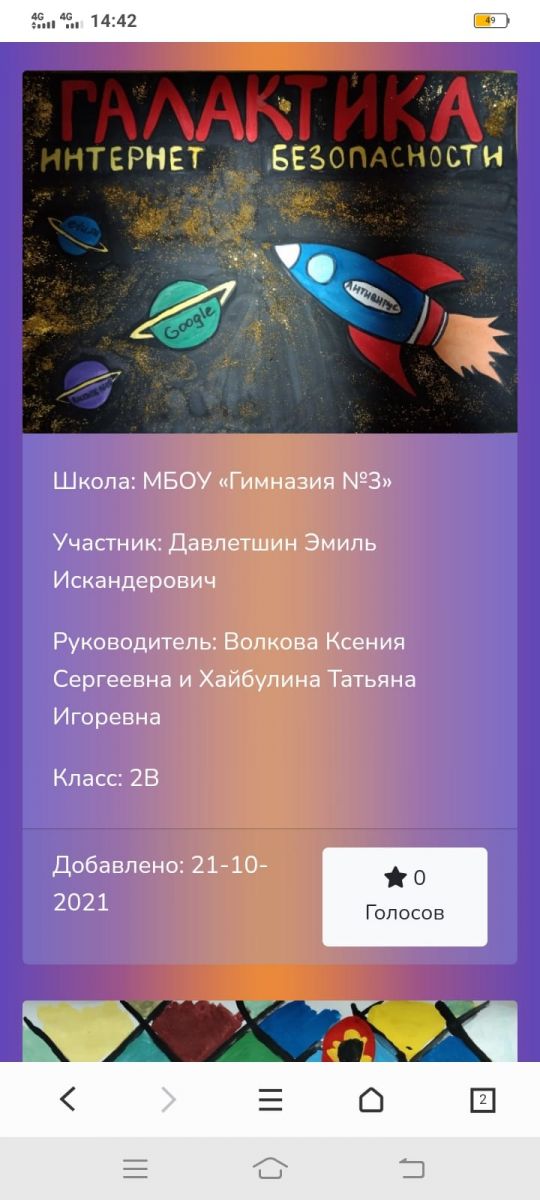 Опубликовано: 25.10.2021Проходит конкурс рисунков на тему «Галактика информационной безопасности», в котором приняли участие ученики 2в класса. Просьба пройти по ссылке и проголосовать за понравившуюся работу.