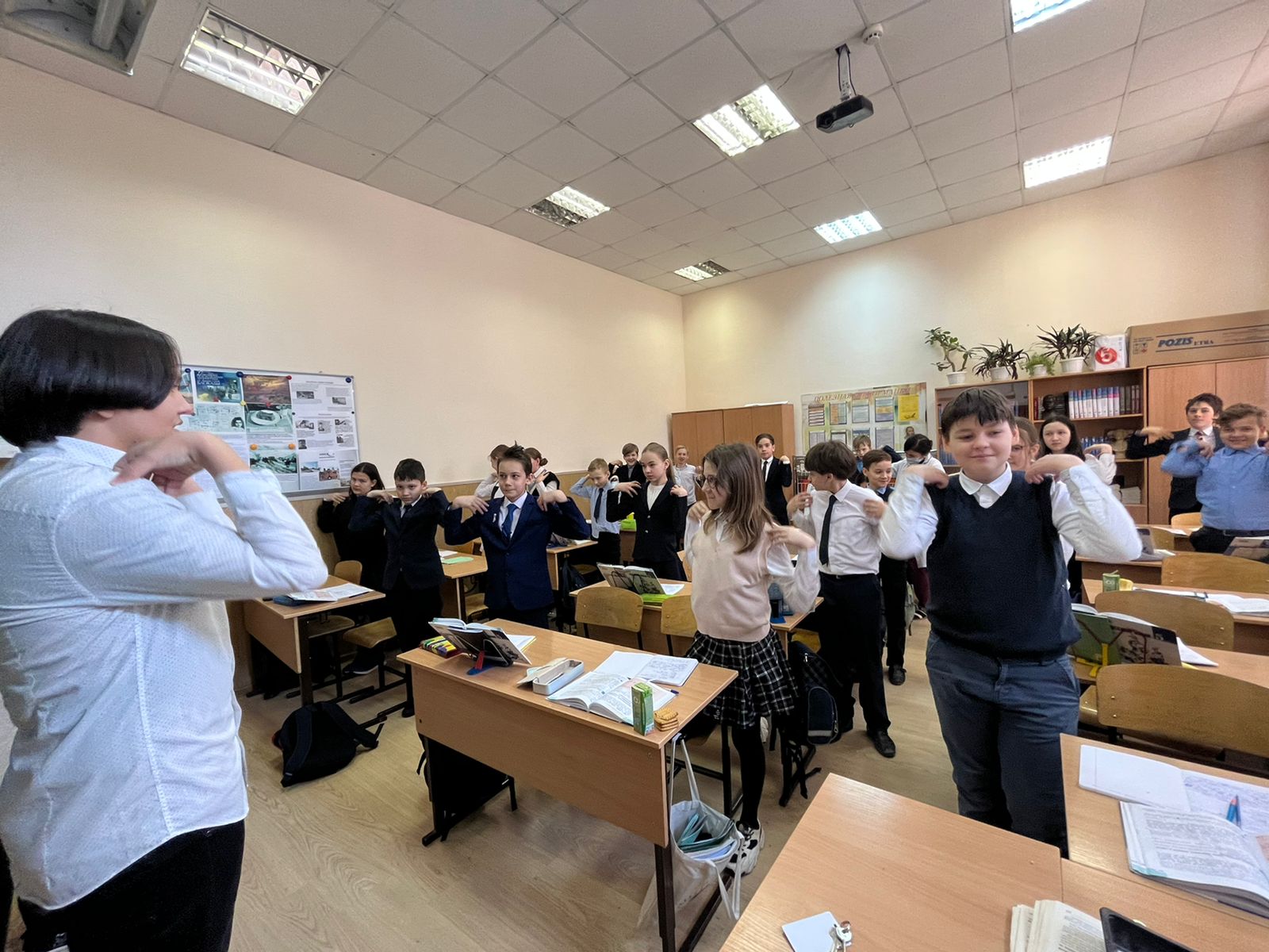 Ученики 5Б класса приняли эстафету от учеников 2Б класса, выполнив зарядку и немного отдохнув, и передают ее ученикам 9А класса.