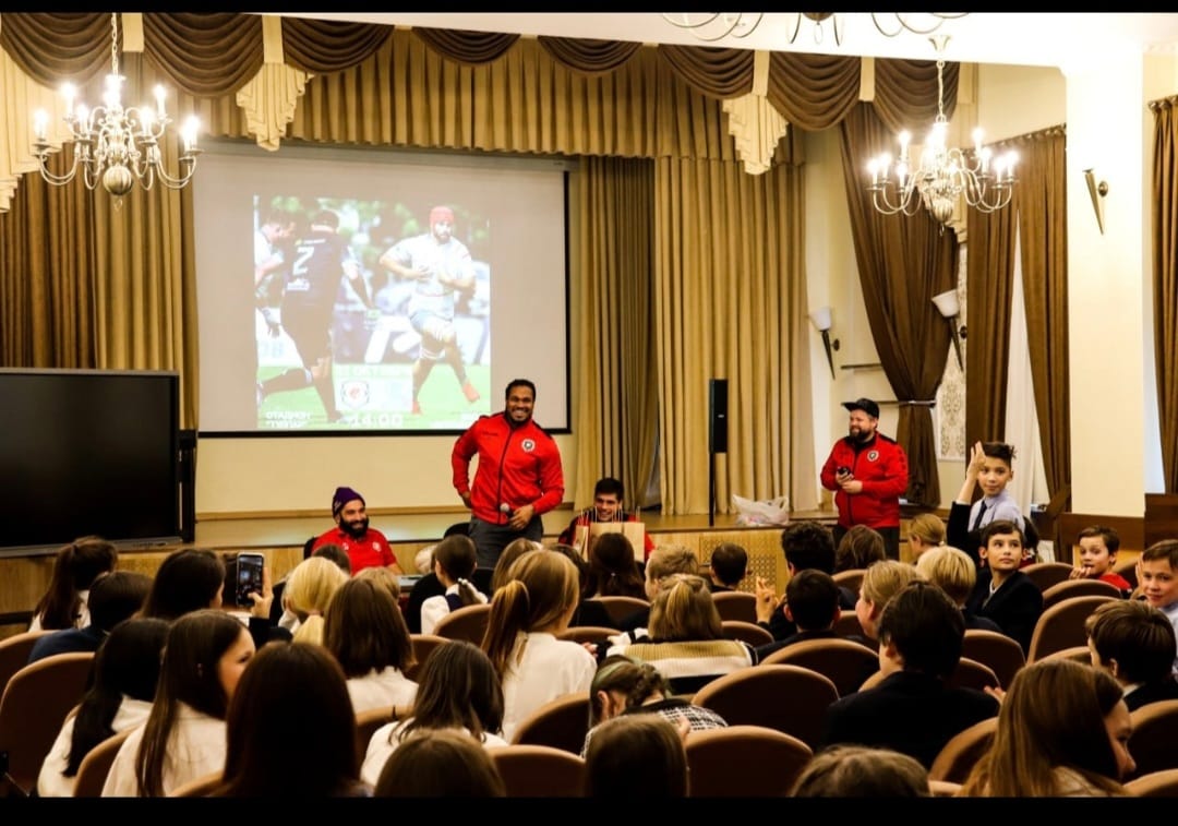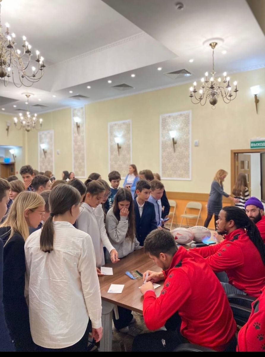 Давыдов, Гриняев и Джордаан рассказали гимназистам о регби, познакомили их с основами вида спорта и ответили на вопросы детей. Так, их интересовало, в каком возрасте игроки «Стрелы» пришли в регби, чем их привлекла эта игра и многое другое. За лучшие вопросы регбисты вручили школьникам футболку с автографами, шарф «Стрелы» и подарки от «Росбанка».