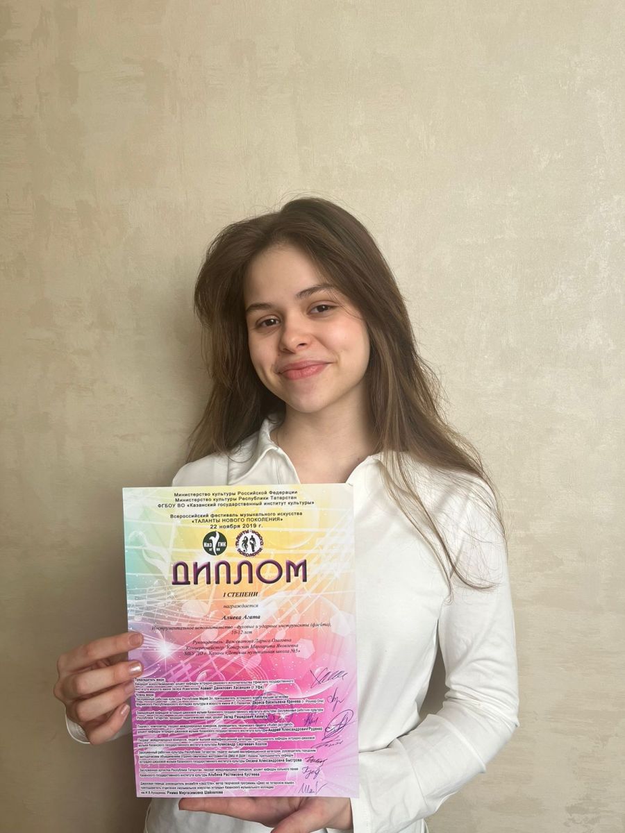 Диплом 1 степении, инструментальное исполнительство - духовые и ударные инструменты (флейта)