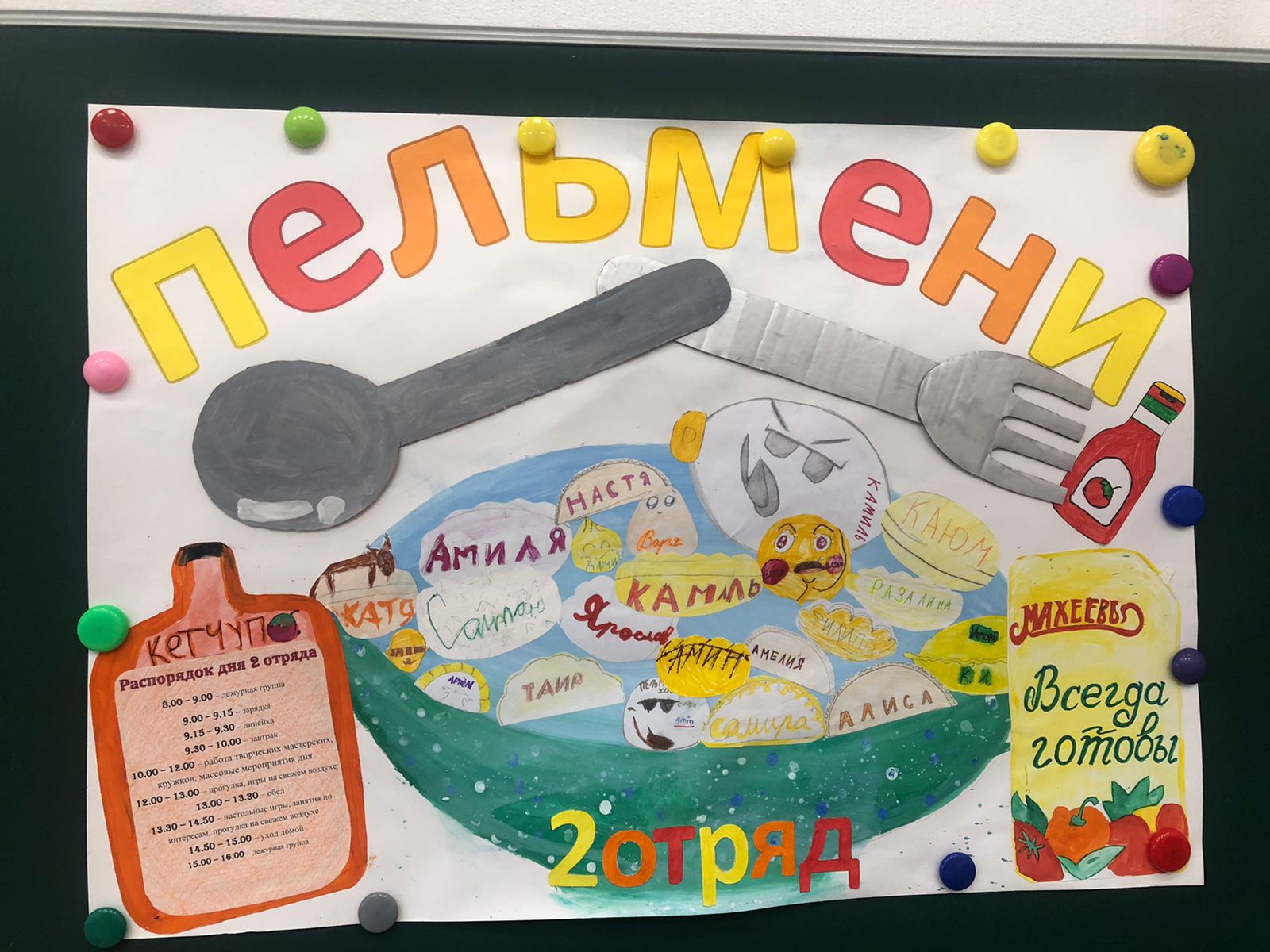 Опубликовано: 31.05.2023В пришкольном лагере был творческий день. Дети придумали эмблему, название и девиз своего отряда. Все свои фантазии они перенесли на плакат.