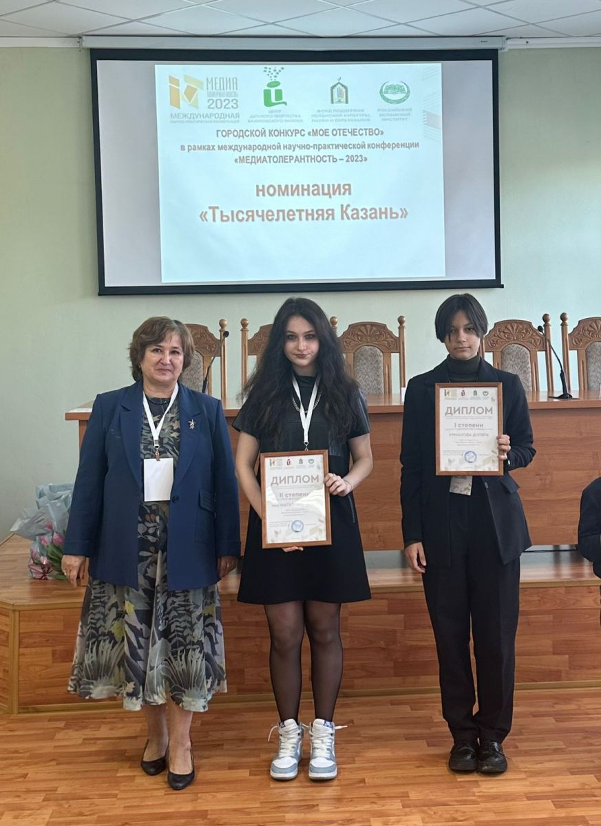 Опубликовано: 02.10.2023Победители городского конкурса «Мое Отечество» в рамках международной научно-практической конференции «Медиатолерантность - 2023» Нигматуллина Дина ( 11а класс), Урманова Диляра (7б класс). Руководитель: Исхак М.В.