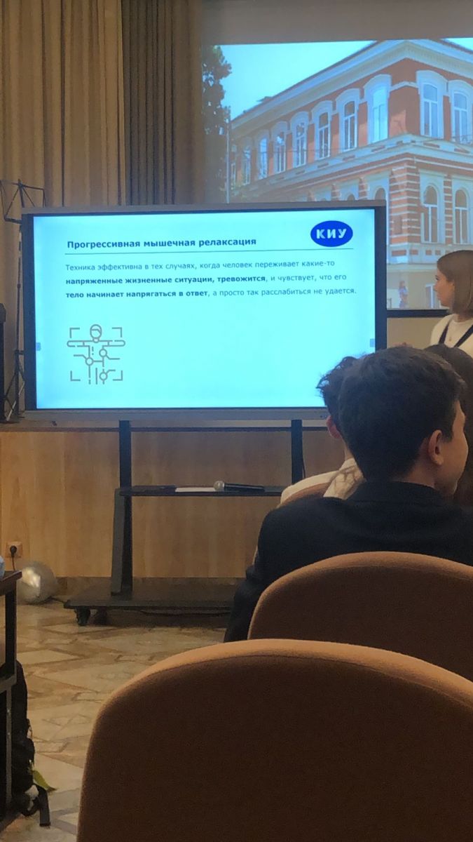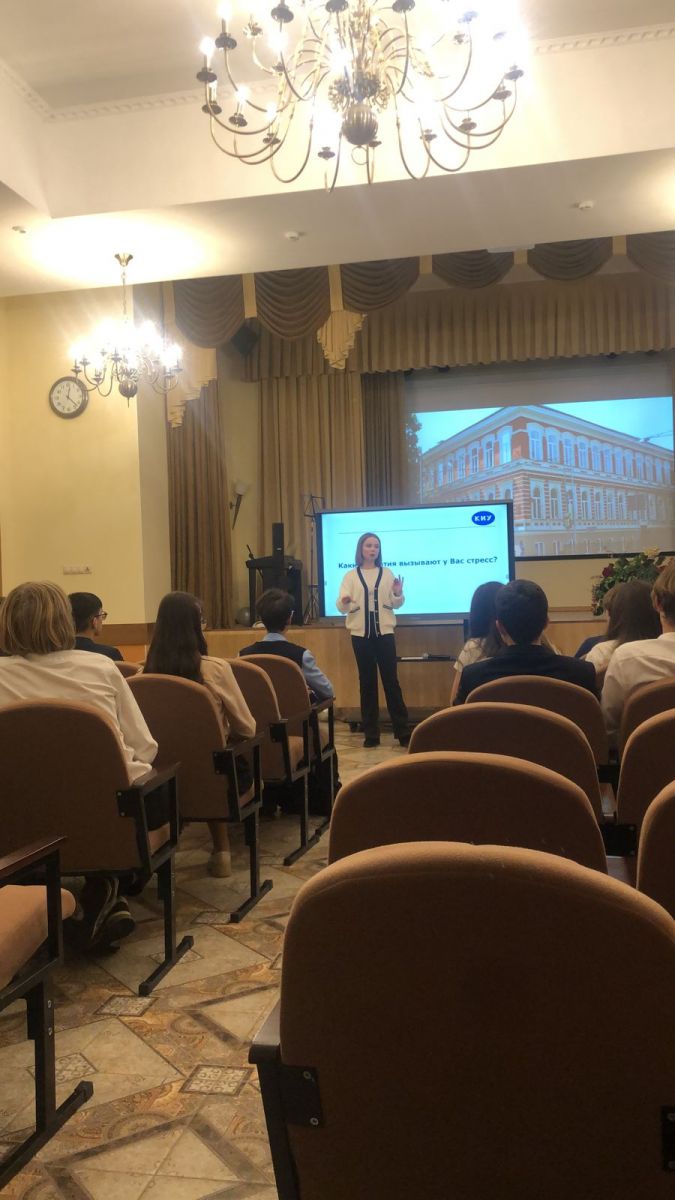 Опубликовано: 23.10.2023Представители КИУ провели профориентационное занятие. Антистрессовый тренинг в помощь при подготовки к ОГЭ и ЕГЭ.