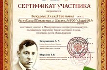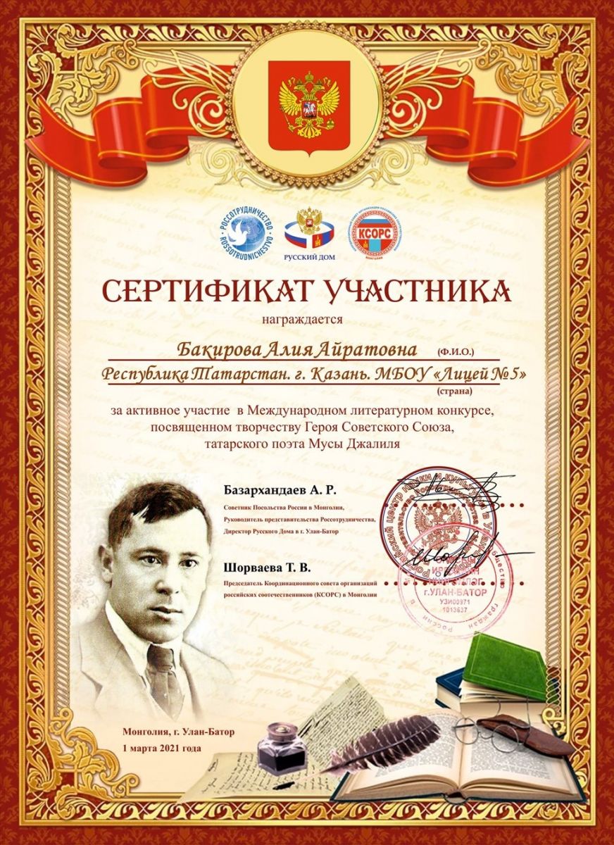 1 марта 2021 года в представительстве Россотрудничества в Монголии, г. Улан-Баторе успешно завершился финальный этап Международного литературного конкурса «Поэт-герой Муса Джалиль». Конкурс проходил впервые в Монголии, по нынешней традиции —в онлайн-формате, но в рамках Года родных языков и народного единства участников чтения стихов Мусы Джалиля на русском, татарском и «языках мира» оказалось даже больше, чем планировали сами организаторы. Оргкомитетом было принято более тысячи работ!!!Конкурсанты представили на суд жюри видеоработы из Монголии и России: Республики Башкортостан, Республики Татарстан, Республики Крым; а также красоту и выразительность поэтического слова изложили в своих работах участники из Республики Беларусь, Республики Молдова, Донецкой Народной Республики, Узбекистана, Казахстана, Кыргызстана, Азербайджана и Украины. В их числе стала участником конкурса и ученица нашего Лицея Бакирова Алия из 3»Б» класса.. Поздравляем участницу финального этапа и желаем дальнейших успехов.