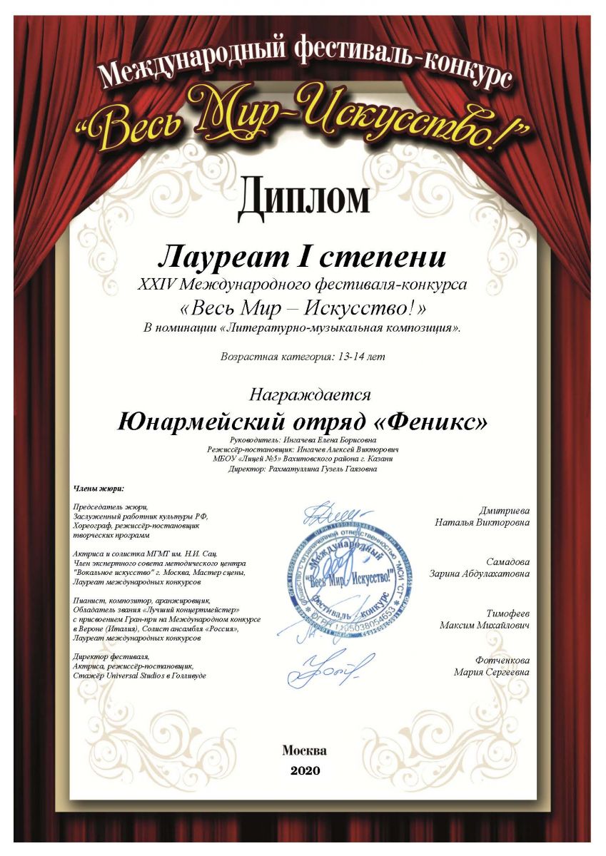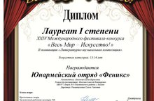 Поздравляем Юнармейский отряд «Феникс» (учащиеся 7»в» класса) с очередной Победой! В Дни празднования 75-летия Великой Победы, в Москве состоялся Международный конкурс- Фестиваль "Весь Мир - Искусство!". Жюри высоко оценило Литературно-музыкальную композицию «Искусство — оружие сильных!» и присудило нашему выступлению звание «Лауреат 1 степени» Молодцы! Так держать! Желаем дальнейших успехов!