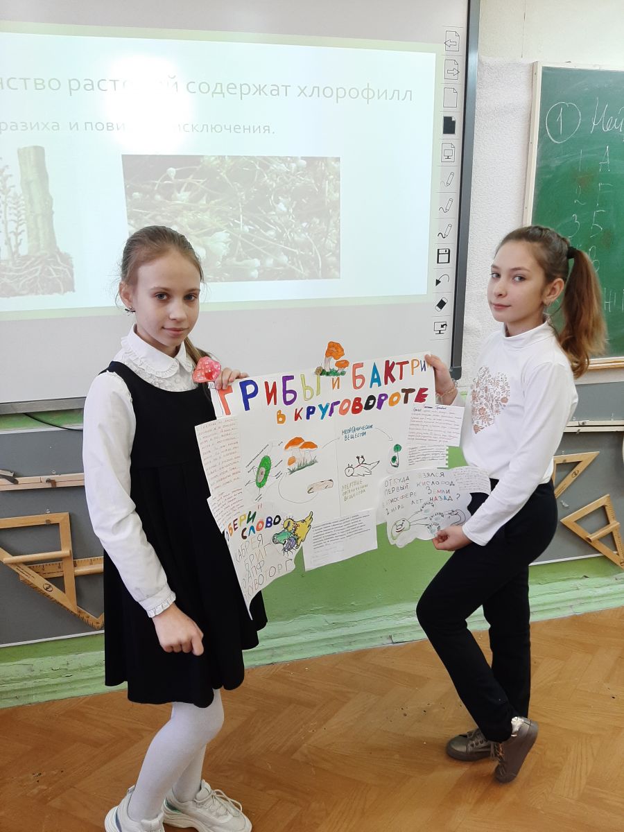 Учащиеся 5 х классов вступают в жизнь среднего звена школы. Проба пера! Защита групповых проектов по экологии бактерий и грибов. Изучая мир этих существ на уроках , выполняя лабораторные работы и оформляя проекты , дети учатся чувствовать себя частью биосферы Земли, мыслить глобально, анализировать экологические проблемы современности.