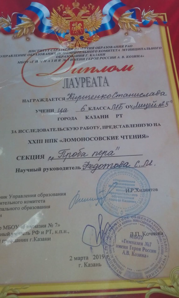 Наш лицей достойно представили ученицы 6 классов: секция «Проба пера» – Спиридонова Ксения – диплом 1 степени (руководитель Марценюк О.С.), Кириченко Станислава – диплом лауреата (руководитель Федотова С.М.); секция «Литература» – Сафронова Елизавета – диплом лауреата (руководитель Марценюк О.С.).