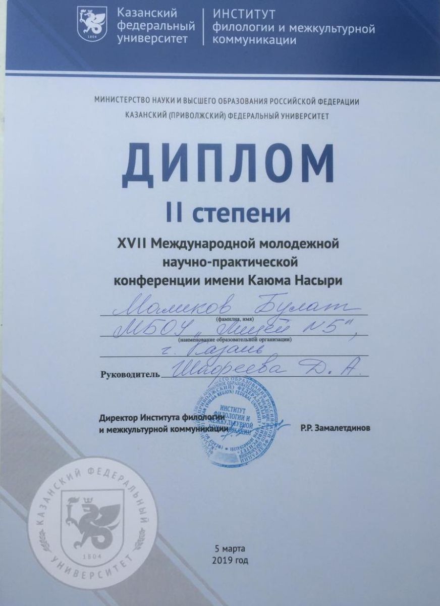 1. Маликов Булат, 10а класс – секция «Татарская филология» - диплом II степени( научный руководитель Шафеева Д.А.);