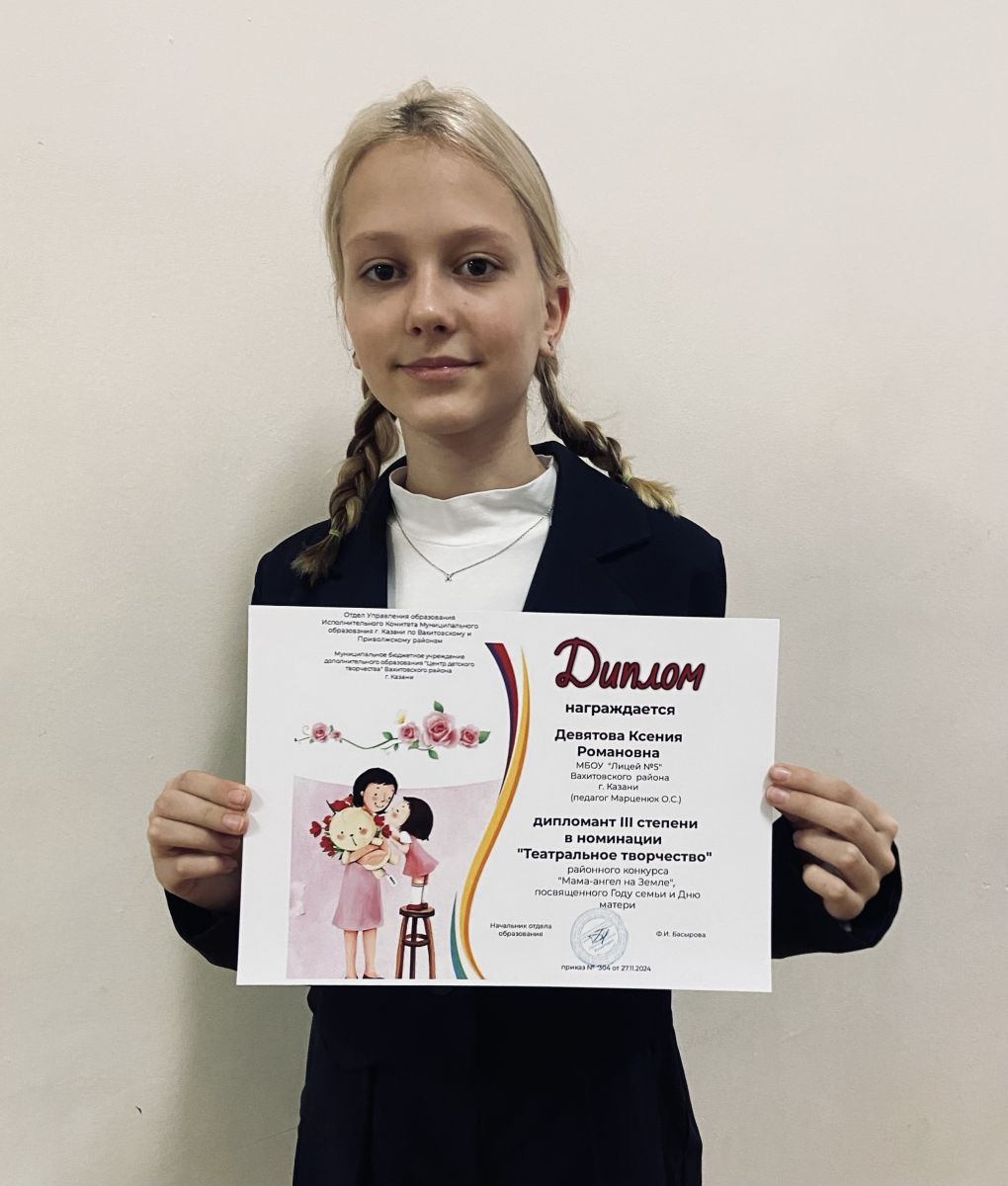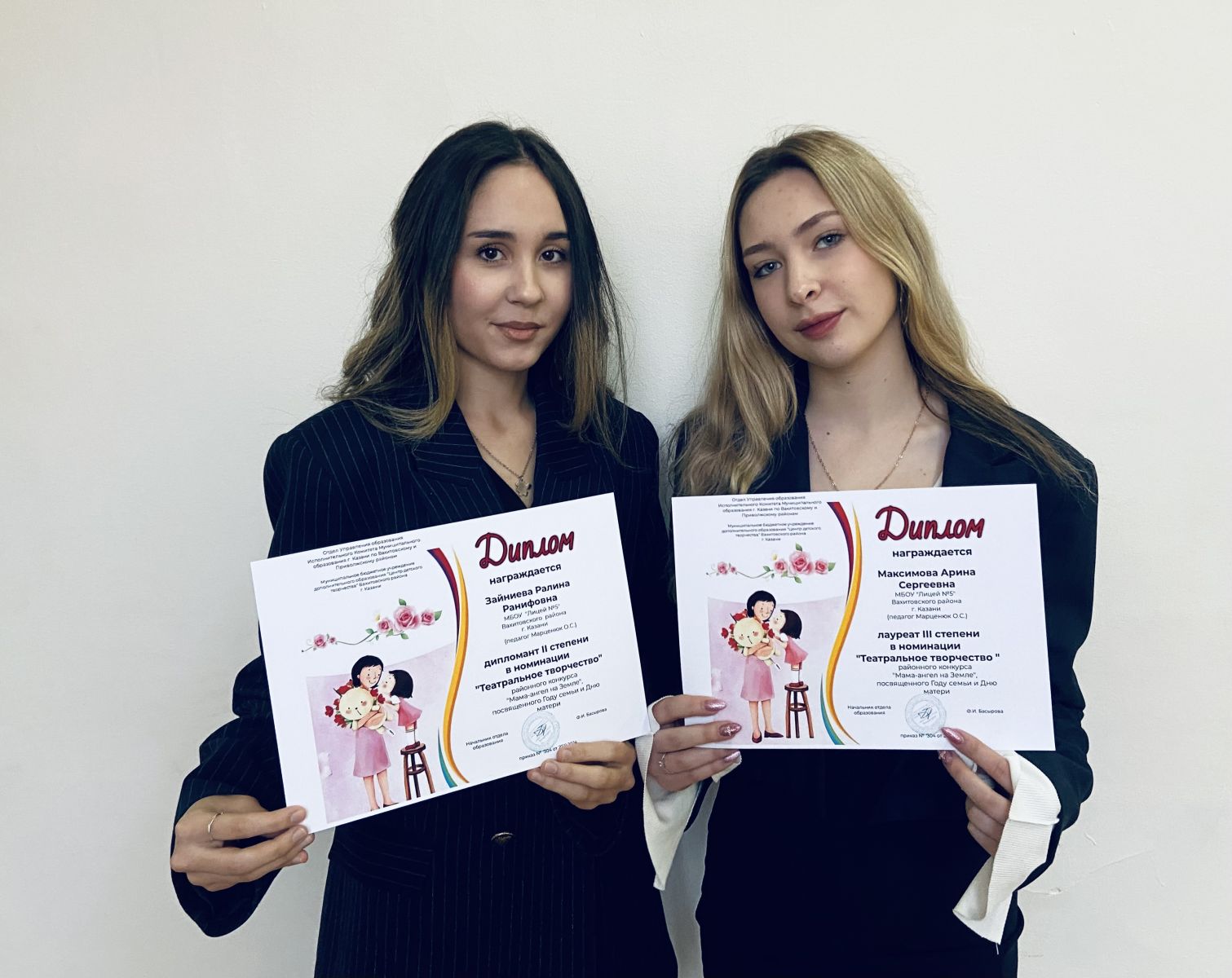 В номинации «Театральное творчество» Девятова Ксения (6в класс) - дипломант 3 степени, Максимова Арина (10б класс) - лауреат 3 степени, Зайниева Ралина (10б класс) - дипломант 2 степени, в номинации «Изобразительное искусство» Трифонова Алисия (10в класс) - лауреат 1 степени, Трифонова Ариана (10в класс) - лауреат 2 степени.