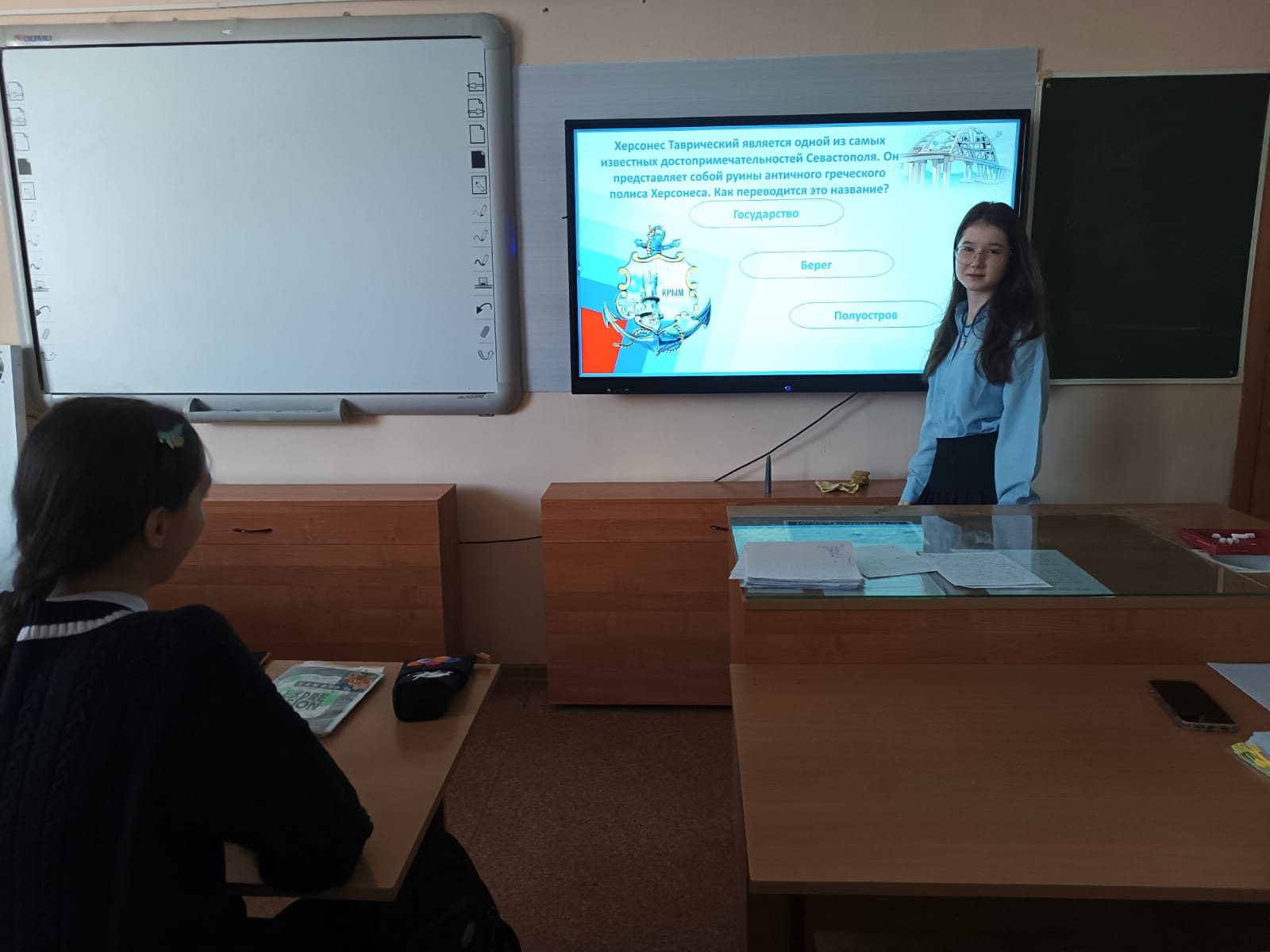 Куратор трека «Наука» РДДМ, Мухамадеева Марьям, провела в 9в и 7в классах познавательное мероприятие с интерактивной викториной «Крым - дорога домой».
