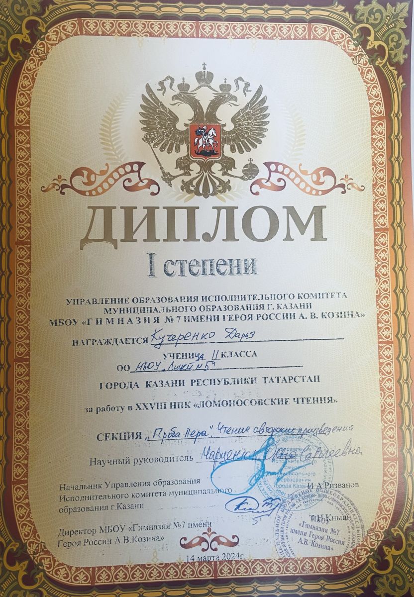 Наш лицей достойно представила ученица 11Б класса Кучеренко Дарья. В своей номинации «Проба пера» по итогам работы жюри Дарья получила диплом 1 степени.