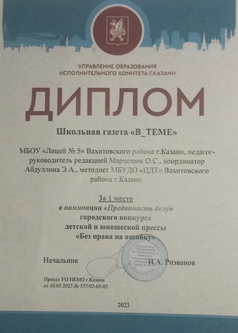 26 июня состоялось награждение призеров и победителей различных городских конкурсов, где редакция лицейской газеты «В_ТЕМЕ» заняла 1 место в городском конкурсе детской и юношеской прессы «Без права на ошибку».