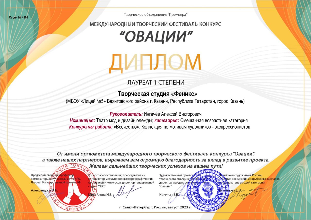 Поздравляем Творческую студию "Феникс" В конце августа а Санкт-Петербурге прошёл Международный творческий фестиваль конкурс "Овации", на котором Творческая студия стала победителем в двух номинациях. В номинации " Театральное искусство" был представлен спектакль "Маленький человечек", в номинации " Театры мод и дизайн костюмов" - номер "Всёчество", коллекция костюмов по мотивам творчества художников-авангардистов.