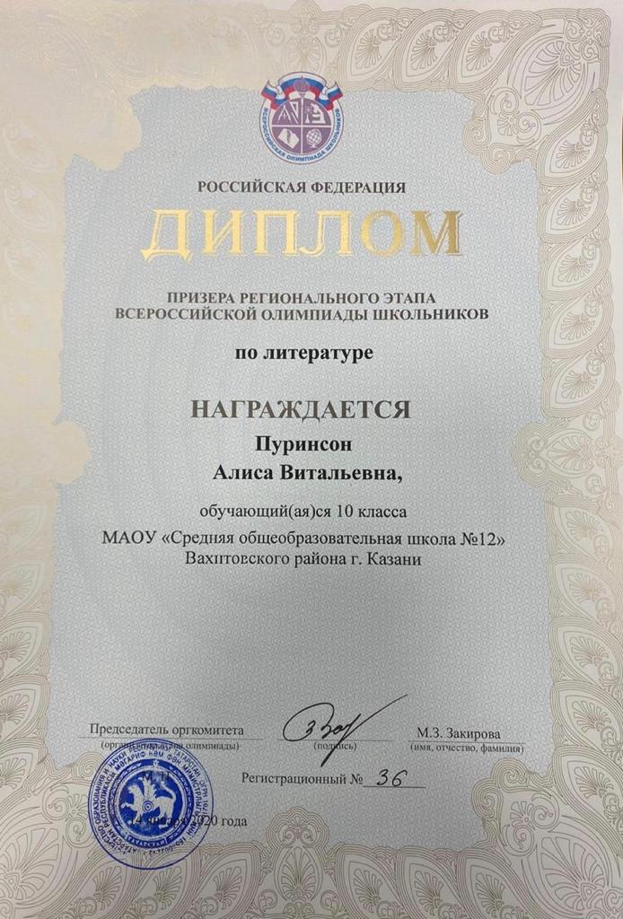 С 13 по 15 января 2021 года прошел региональный этап всероссийской олимпиады школьников по литературе. Поздравляем Пуринсон Алису, ученицу 10а класса, которая стала призером. Желаем успехов в учёбе и дальнейших побед.