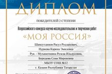 Высокой награды, диплома второй степени Всероссийского конкурса научно-исследовательских творческих работ "Моя Россия" удостоена работа учеников 4 класса Расула Шамсутдинова и Карины Нуриевой. Руководители проекта - преподаватели С.М. Бородова и Р.И. Мухаметшина.