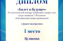 Подведены итоги республиканского конкурса "Билет в будущее", организованного Министерством труда, занятости и социальной защиты РТ. Победителем стала ученица нашей школы Камила Куликова. Ей вручен диплом за 1 место и ценный подарок. Победа стала возможной благодаря поддержке педагога Марии Сергеевны Петрухиной.
