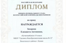Поздравляем ученицу 10 класса Захарову Елизавету с наградой - Дипломом призера регионального этапа Всероссийской олимпиады по праву. Желаем новых побед в следующих этапах олимпиады.