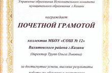 Почетной грамотой Управления образования Исполнительного комитета г. Казани награжден коллектив нашей школы.