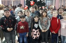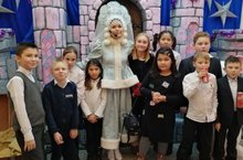 Учащиеся 1Б и 4А класса посетели новогоднее представление с Дедом Морозом и Снегурочкой.