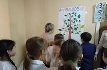 Ребятам начального звена вместе с советником по воспитанию и классным руководителем провели акцию «Дерево доброты», где каждый ребенок на листочке написал пожелание мира и добра