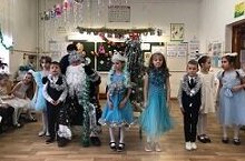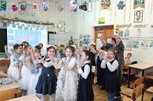 В начальной школе прошли новогодние утренники. Дети читали стихи, пели песни, играли в подвижные игры, водили хороводы. На праздник к ребятам пришли Дед Мороз и Снегурочка.