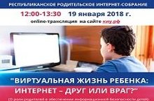Уважаемые родители! 19.01.2018 с 12.00 до 13.30 состоится Республиканское родительское интернет-собрание «Виртуальная жизнь ребенка: интернет – друг или враг?». Он-лайн трансляция собрания будет вестись на сайте Казанского инновационного университета имени В.Г.Тимирясова по адресу: https://ieml.ru/.