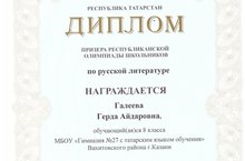 Поздравляем ученицу 8 б класса Галееву Герду с победой в заключительном этапе Республиканской олимпиады школьников по русской литературе и учителя, подготовившего призера, Каюмову Алию Магзумовну! Желаем вам успехов и дальнейших побед!