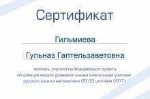 Учитель математики Г.Г. Гильмиева приняла участие в Федеральном проекте «Апробация модели уровневой компетенции учителей математики». Гульназ Гаптельзаветовна успешно прошла все испытания и получила подтверждающий сертификат МОи Н РФ, РГПУ им. А.И. Герцена. Поздравляем!