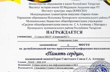 Ученица 11 б Темипрханова А(руководитель Гильмиева Г.Г.) приняла участие в РНПК «Память сердца», посвященной памяти Героя Советского Союза Сабира Ахтямовича Ахтямова Успешно пройдя отборочный ,Алия представила свое исследование на очном 2 туре и получила 2 место.Поздравляем!