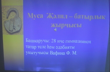 15 нче февраль көнне Муса Җәлилнең тормыш юлы һәм иҗатына багышланган 1-7 нче сыйныф укучыларына презентация дәресләр үткәрелде. Укучылар М.Җәлилнең язмышы һәм аның батырлыгы турында хәйран калып тыңладылар. (Укытучылар: Вафина Ф.М., Гөлкәева Р.Р., Шәрифуллина, Нәбиуллина Р.Г.)