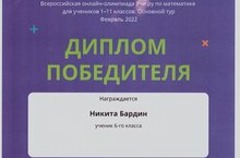 Поздравляем ученика 6а класса Бардина Никиту с победой на Всероссийской онлайн-олимпиаде Учи.ру по математике! Желаем дальнейших успехов!