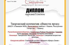 Творческий коллектив «Вместе ярче» - лауреат I степени международного фестиваля-конкурса «Свершение» в номинации «Театральное творчество». Педагоги Р.И. Самигуллина, Ю.А. Садриева, Е.Н. Печникова награждены благодарственными письмами за подготовку победителей (Международный арт-центр «Наследие», Санкт-Петербург, 2022).