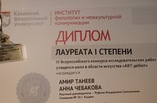 Чебакова Анна (9 кл.), Танеев Амир(8б кл.) стали лауреатами 1 степени IV Всероссийского конкурса исследовательских работ в области искусства «АRТ-дебют».Секция «Теория и история музыкального искусства». Руководитель учитель высшей категории Самигуллина Р.И. Поздравляем!