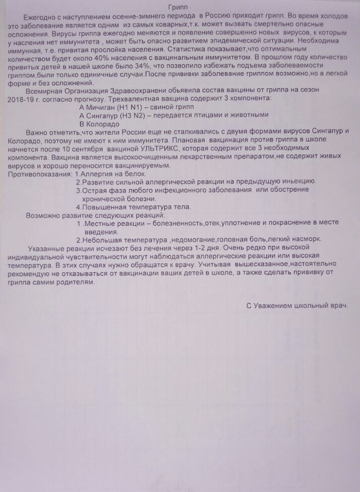 - Информация по гриппу от школьного врача 10.09.2018