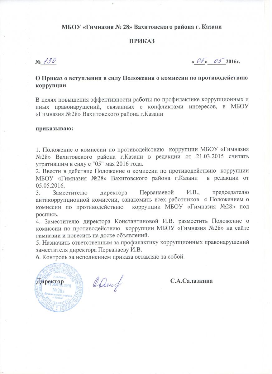 Приказ о вступлении в силу положения по антикоррупции