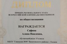 Поздравляем Сафину Алину 10 в, призера республиканской олимпиады по обществознанию!!!