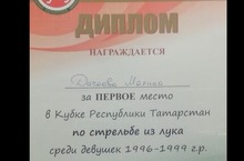 Ученица 8Б Дачаева Малика заняла первое место на Кубке Республике Татарстан по стрельбе из лука.