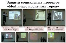 Новым мероприятием стала защита социальных проектов. В этом году все они были посвящены одной теме: «Наш класс носит имя героя». Ребята защищали свои проекты, насколько они продвинулись в увековечении памяти партизан и подпольщиков, чьи имена удостоились носить. Победителем стал 7А класс, носящий имя поэта и партизана Заки Нури (классный руководитель Исмагилов Р.Р.). Вторыми стали учащиеся 6А класса с проектом, посвященным Абдулле Алишу (классный руководитель Петер Г.В.). Третьими стал 7Б класс имени Михаила Девятаева (классный руководитель Газизова К.Р.)