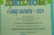 Бакчабызның зурлар төркемендә тәрбияләнүче Афлятунова Адилә, "Татар малае, татар кызчыгы - 2021" район бәйгесендә катнашып, "Гүзәл кыз" номинациясенә лаек булды.