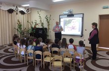 Татар теле тәрбиячесе Гыйлметдинова Р. А. язучының тормыш юлын, презентация аша балаларга, янә, тасфирлап бирде.